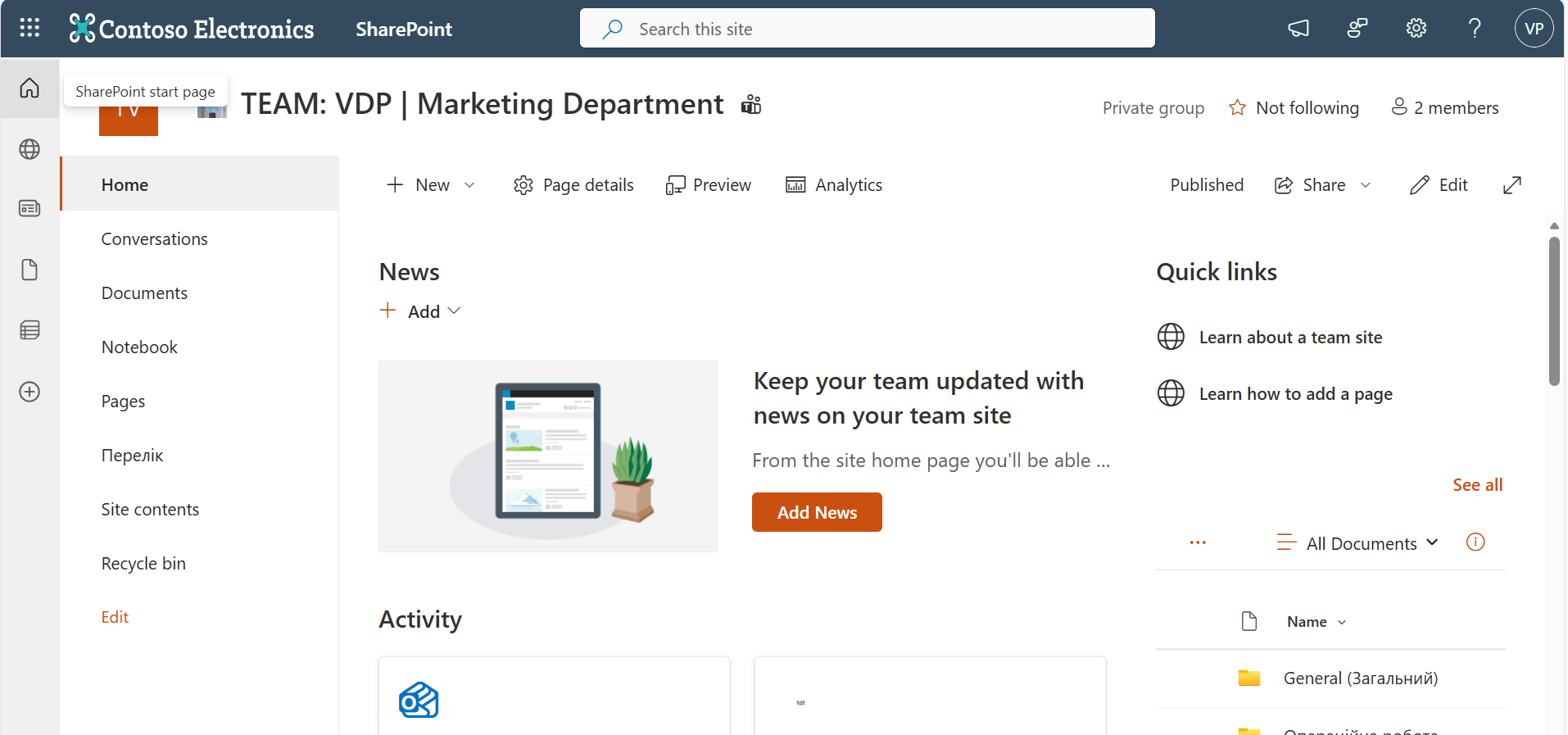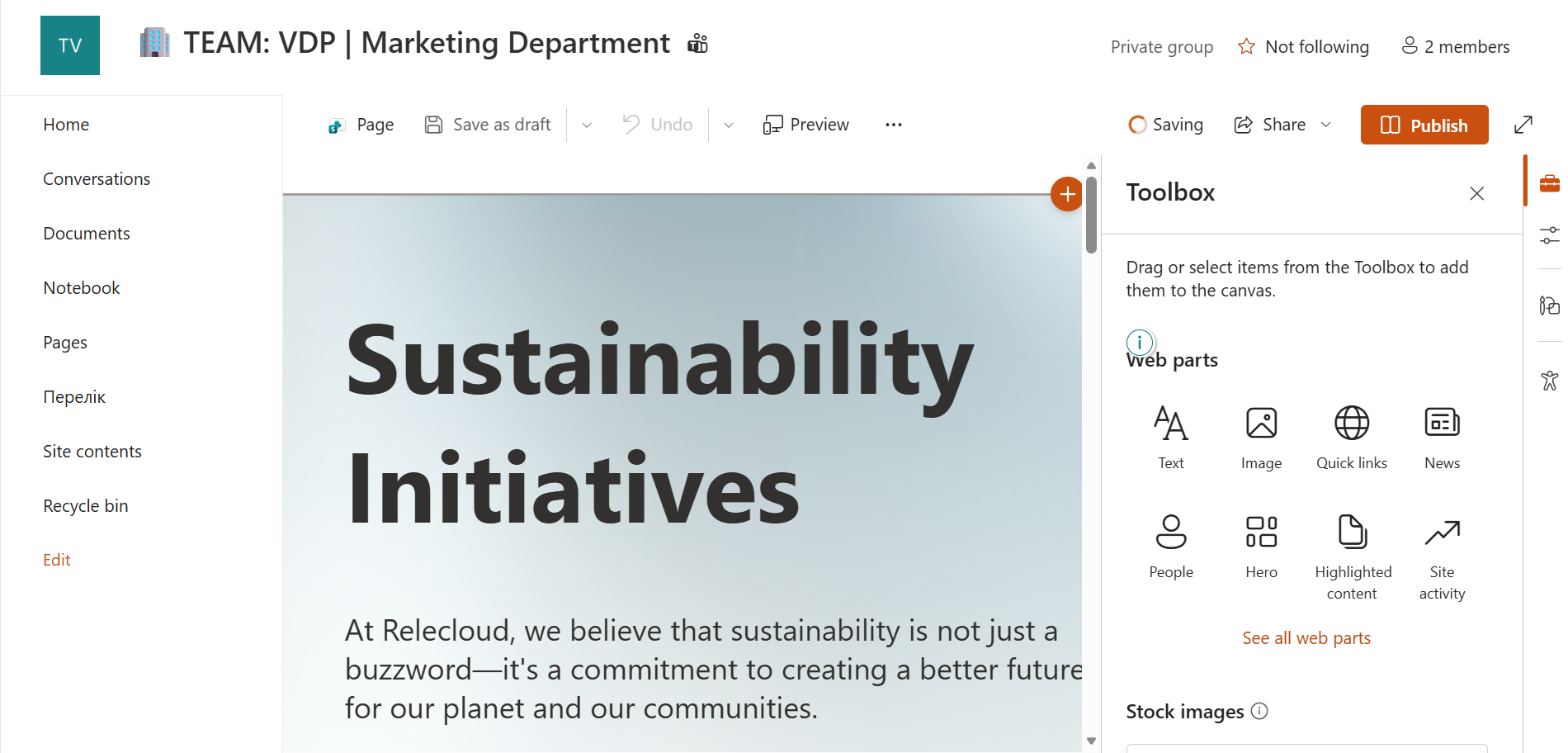 - Click on sections to add new web parts (text, images, links, lists, etc.).