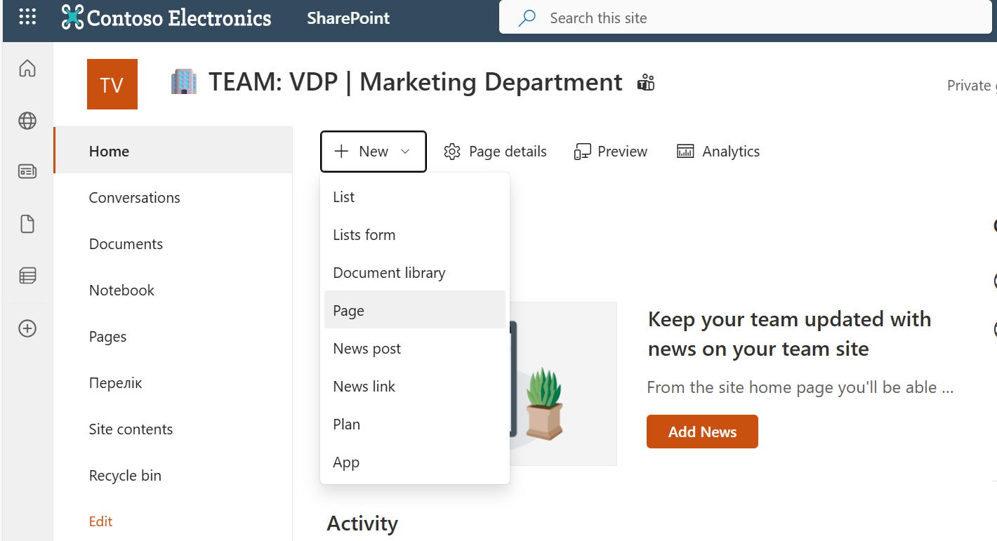 📌 Only users with "Edit" permission can create or edit pages. If you don’t see the "New" button, contact your site owner or admin.