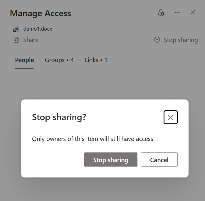 Effect: - All sharing links are removed. - External and link-based access is revoked. - Group and site permissions remain unchanged.