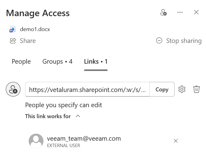 It contains the following sections: - People – users with direct access - Groups – access inherited from site or Microsoft 365 groups - Links – sharing links created for the item